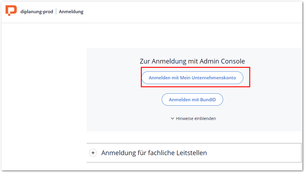 Aufruf der Login-Seite auf DiPlanBeteiligung